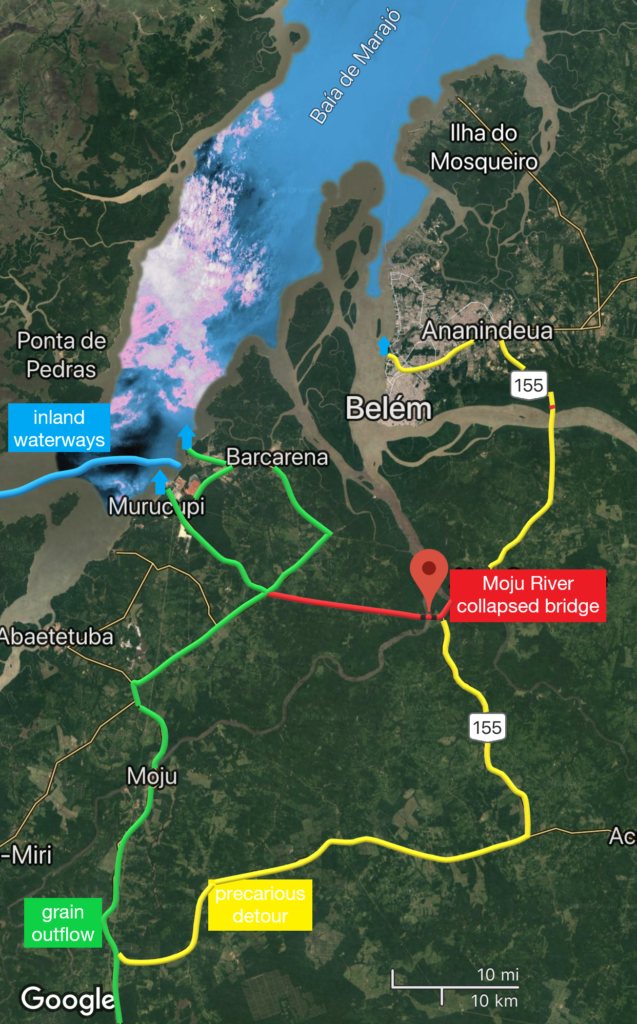 – While no major disruptions are reported in the grain outflow from northern Mato Grosso to the Amazon ports, soya farmers in the northeast of Pará, who haul the oilseed to Barcarena port terminals by road, are suffering the blow because the collapse of the bridge together with the poor conditions of the alternative roads due to heavy rains cause the trucks to take a detour that adds some 1,200 kilometres in the round trip, resulting in delays in the shifting of the commodity and increase in the road freights