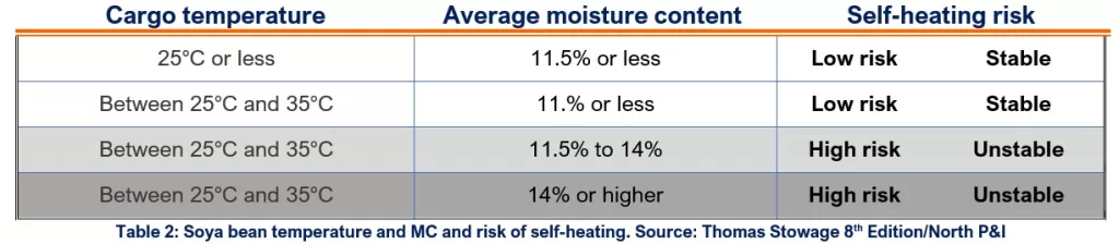 Due to their intrinsic nature, soya beans are prone to microbiological deterioration and self-heating if their MC and temperature exceed certain limits. These risks tend to be exacerbated on long sea passages, as is the case with shipments departing to China that take 40 days or more to arrive, plus the time from the fields to the loading port and the waiting time for the vessel to unload the cargo at the discharge port. Not surprisingly, the main cause of damage to soya bean cargoes discharged at Asian ports is microbiological instability and self-heating. (Table 2)
