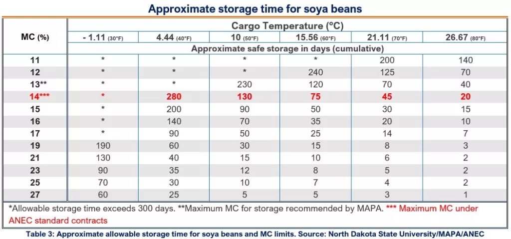 Although there are variations in quality and storability of individual types, soya beans with temperatures above 21°C are assumed to have a safe storage time between 45 days (with moisture content up to 14%) and 125 days (MC up to 12%). Indeed, The tendency is that the higher the air temperature, relative humidity and precipitation rate at loading, the higher the bean MC and temperature – and the shorter the safe storage time. (Table 3)