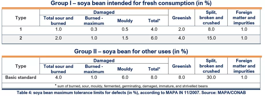 IN 11/2007 classifies the Brazilian soya bean into Group I, intended for consumption in natura, and Group II, the basic standard for other uses, such as crushing for meal and oil extraction and export. (Table 4)