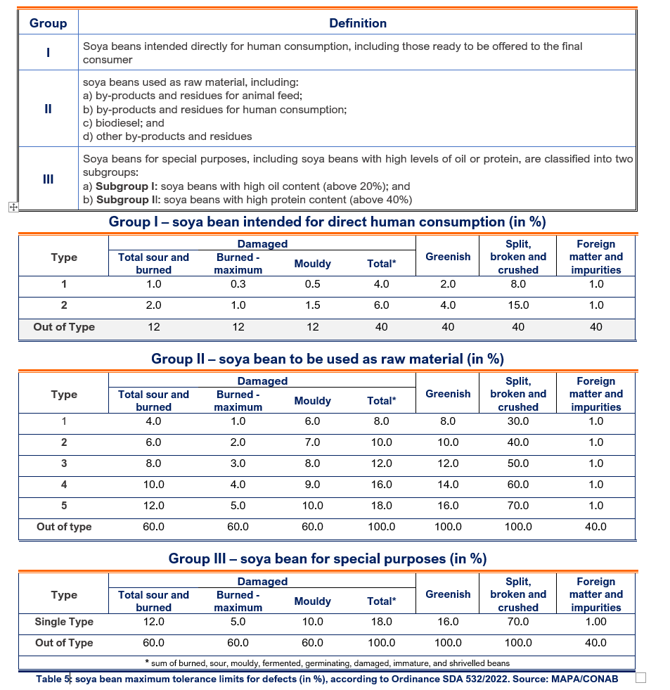 Through Ordinance SDA 532/2022, MAPA proposes adding new types to the existing groups and creating a third group grading the bean according to its oil and protein content. It also changes the tolerances for defects, especially sour, mouldy and burned beans. (Table 5)