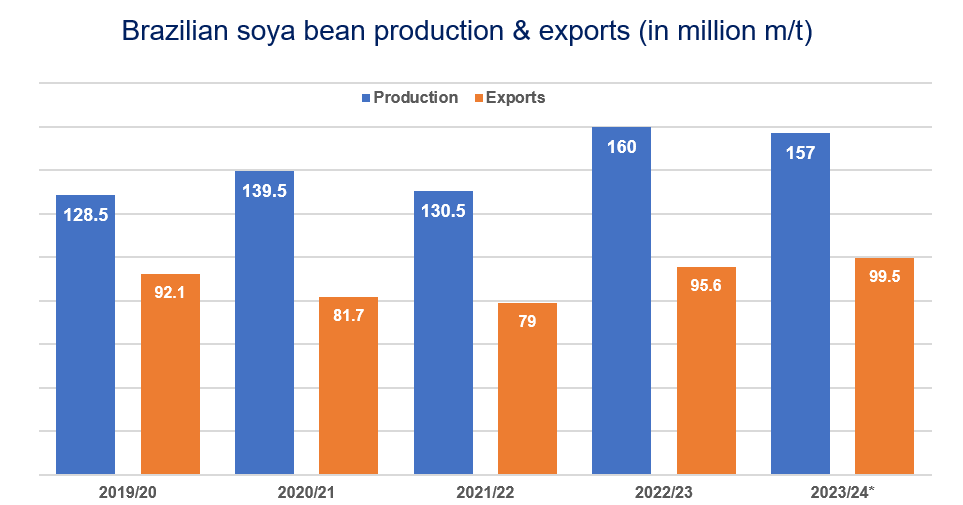 Brazil reached record figures in soya bean production and exports in the 2022/23 marketing season. As the 2023/24 sowing nears completion, the country is bound to maintain very high levels and continue comfortably reigning as the world’s largest oilseed supplier, followed by the United States and a recovering Argentina.