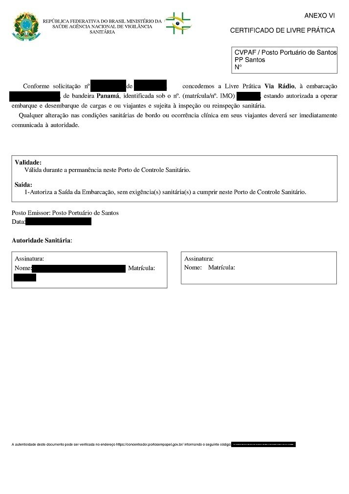 As the federal port health authority, on 13 May 2022, ANVISA issued a Circular Letter informing the port and navigation sectors that, as established in the Law that instituted the BR do Mar stimulus program, vessels operating in cabotage, port support, maritime support and inland waterways are exempt from presenting a Free Pratique Certificate (Certificado de Livre Pratica – CLP) when calling at national ports.