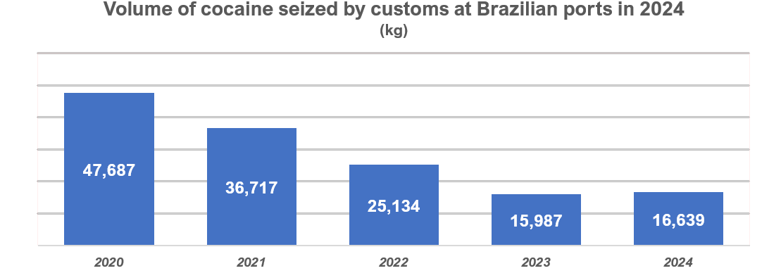 The downturn is particularly evident at the busiest port complexes, especially that of Santos, where the amount of narcotics seized by customs dropped from 7,100 kilograms in 2023 to 5,982 kilograms in 2024, marking a 16% decrease. Although the official figures for customs seizures will only be released in the ‘Customs Balance Sheet 2024’ to be published in the coming weeks, the reported seizures in ports and port facilities last year increased by around 4%. Figure 4