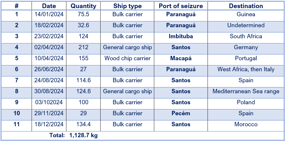 During the same period, at least seven vessels that departed from Brazil after calling at one or more national ports were intercepted abroad, revealing cocaine hidden in their sea chests. It should be noted that the port where the drugs are seized does not necessarily indicate their final destination. In many cases, the drugs are detected and confiscated at ports that are either before or after the one where the traffickers intended to reclaim them. Figure 7