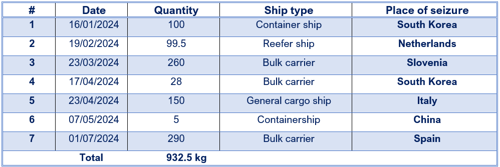 Exporting cocaine in shipping containers remains the method of choice for drug smugglers, as evidenced by the large quantities regularly recovered by customs and police forces in container terminals. In 2024, authorities intercepted 42 boxes carrying over 11 tonnes of cocaine. The drugs were concealed in dry containers, primarily using the ‘rip on/rip off’ method; in this approach, legitimate containerised shipments are exploited by criminals to transport cocaine from the place of origin to the country of transhipment or final destination.