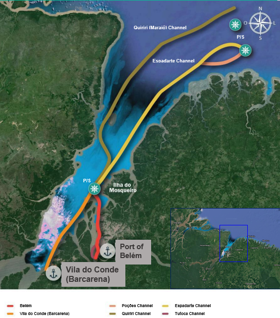 The Amazon ports of Belém and Vila do Conde in Barcarena, home to modern grain terminals that help outflow Brazilian agriproducts, are accessible from the Atlantic Ocean through the Quiriri Channel or the Espadarte Channel, in Pará River, Brazil’s Northern Arc.