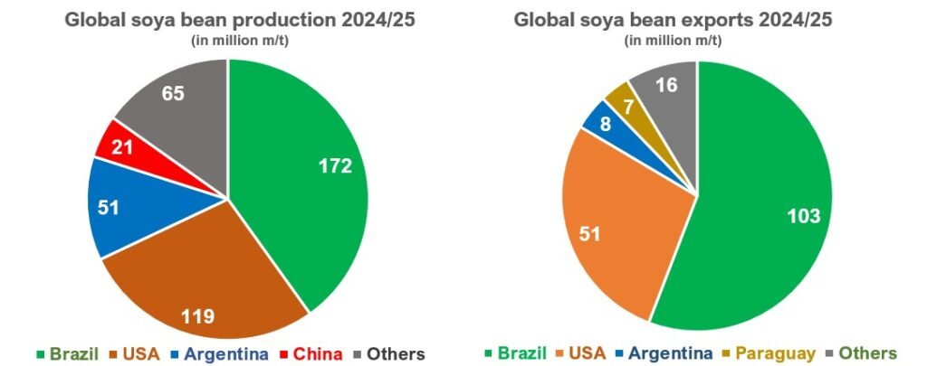 Brazil has solidified its position as the world’s leading soya bean producer and exporter, shipping more than three-quarters of its exports to China. This is notable even amid China’s renewed purchases of US soya beans during the 2024/25 marketing year.