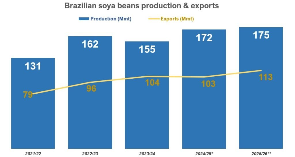 During the 2024/25 season, Brazil reached a record soya bean production of 171.5 million metric tons (Mmt), representing 40% of the global output, followed by the United States (119 Mmt), Argentina (51 Mmt), and China (20.7 Mmt). It exported 104 Mmt of the oilseed, covering 56% of the world’s exports, while the USA exported 51 Mmt, Argentina 7.9 Mmt, and Paraguay 6.6 mmt. The National Supply Company (CONAB), the federal agency responsible for managing the country’s agricultural and supply policies, estimates the closing season will end with over 107 Mmt of soya beans exported. Figure 1