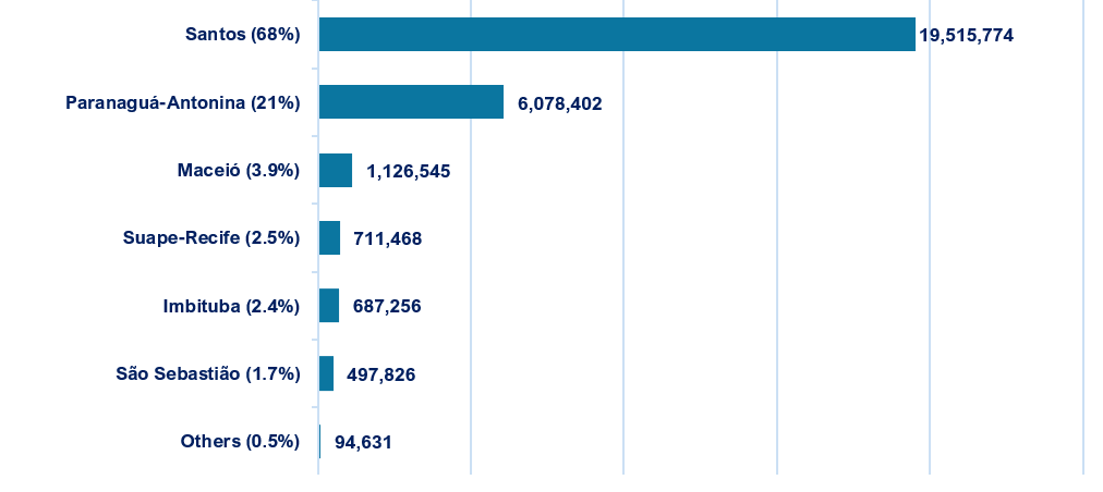 Figure 3: Top sugar handling ports and share of participation, Jan-Nov 2025, in m/t. Source: ANTAQ
