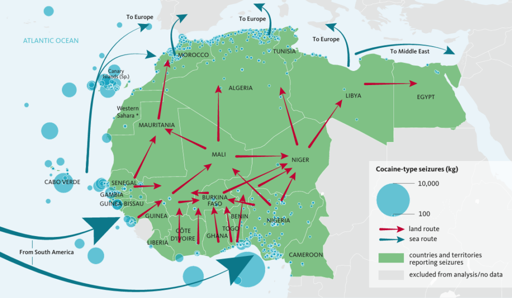 For decades, West African nations have served as key transhipment points for cocaine smuggled across the East Coast of South America to the profitable European consumer market. Drug trafficking between these continents has employed various methods, including drug air couriers (drug mules) who carry small parcels on commercial flights, as well as larger quantities transported on cargo vessels, where drugs are concealed within shipping containers and general cargo.